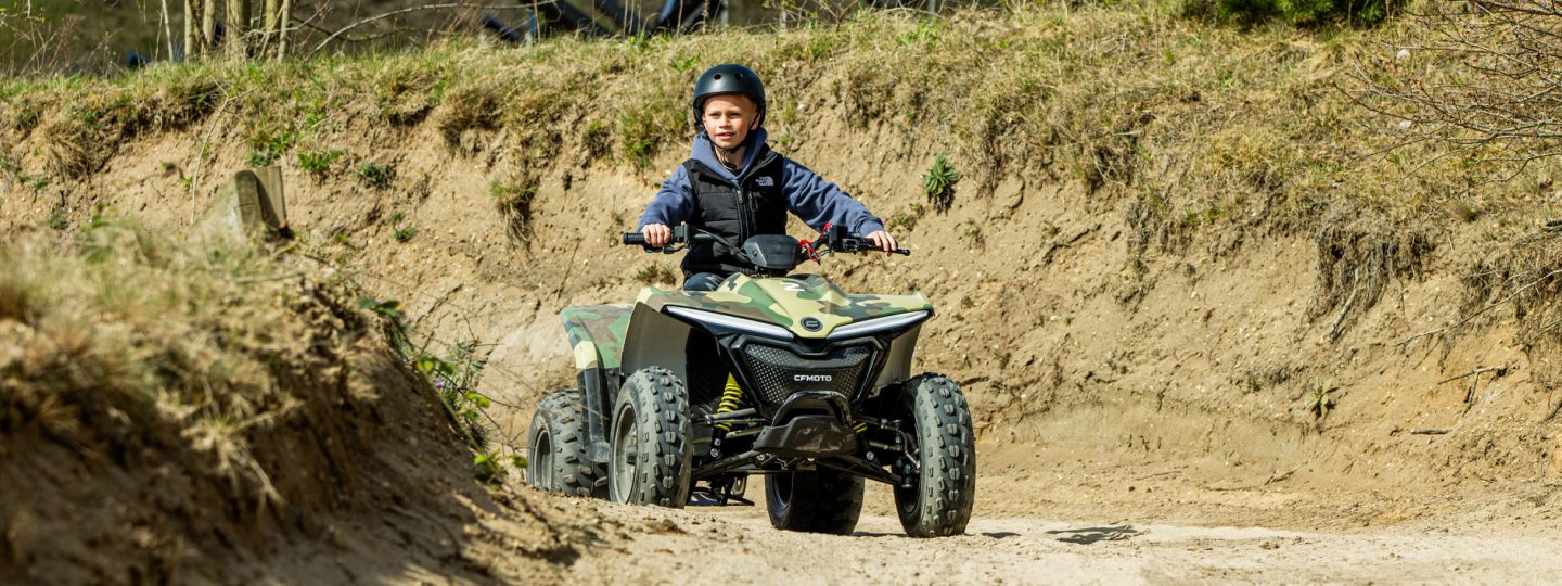 Zet je helm op en stuur de mini-quad over het uitdagende zandparcours.