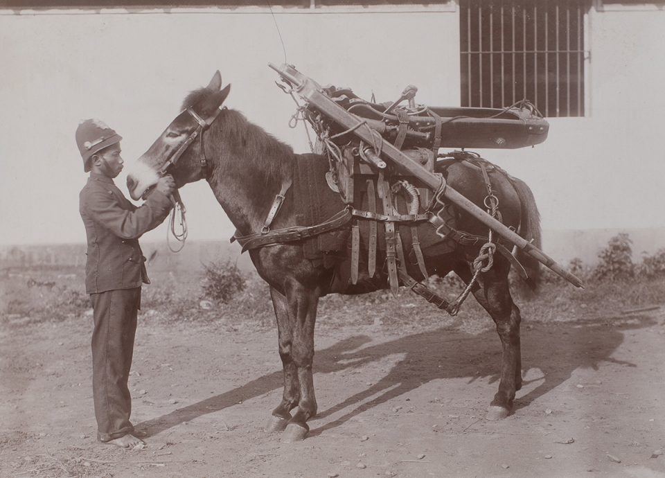 Pieter komt niet alleen bijzondere portretten tegen. “Tijdens mijn onderzoek kwam ik een heel groot album tegen over de Artillerie Constructie Winkel (ACW) in Surabaya.” Het album is samengesteld rond 1895 door de fotostudio Charls & Van Es & Co. De ACW was een belangrijke militaire werkplaats in Nederlands-Indië. Hier werden wapens, munitie en uitrusting geproduceerd en onderhouden, waaronder ook uitrusting voor paarden en muildieren. “Op deze foto zie je de uitrusting van een beladen geschutmuildier.”